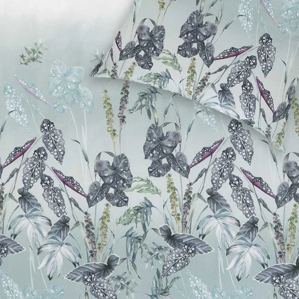 Soraia to nie pościel — to arcydzieło snu. Zainspirowana tajemniczymi ogrodami i egzotycznymi krajobrazami, zdobi ją wielkoformatowy, botaniczny motyw — stylizowane liście i rośliny w głębokich odcieniach zieleni, lili, antracytu i intensywnego azuru. Tło? Delikatny gradient, który rozświetla kompozycję i dodaje głębi — jak mgła unosząca się nad tajemniczą oazą. Efekt? Hipnotyzujący, artystyczny, pełen nastroju.