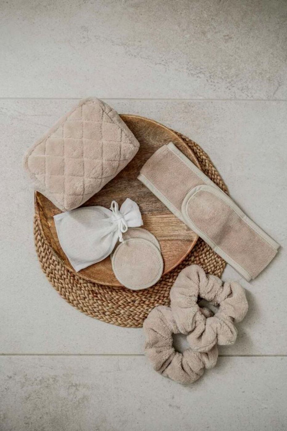 Produkty są wykonane z trwałego materiału składającego się w 50% z bawełny i w 50% z poliestru, co czyni je odpowiednimi do wielokrotnego użytku. Minimalistyczna, kompaktowa kosmetyczka sprawdzi się zarówno podczas codziennych zabiegów SPA, jak i w podróży.