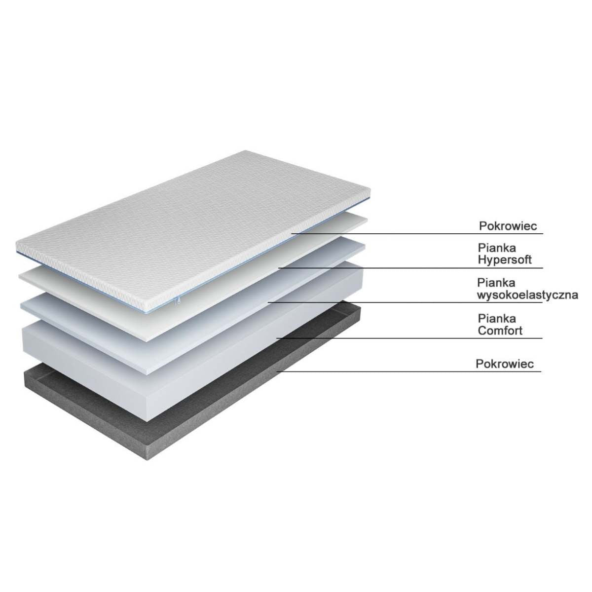 warstwa górna odpowiada z higienę i jest niezwykle przyjemna i delikatna w odczuciu. Doskonale przepuszcza powietrze, dzięki czemu materace nie gromadzą temperatury ani potu,