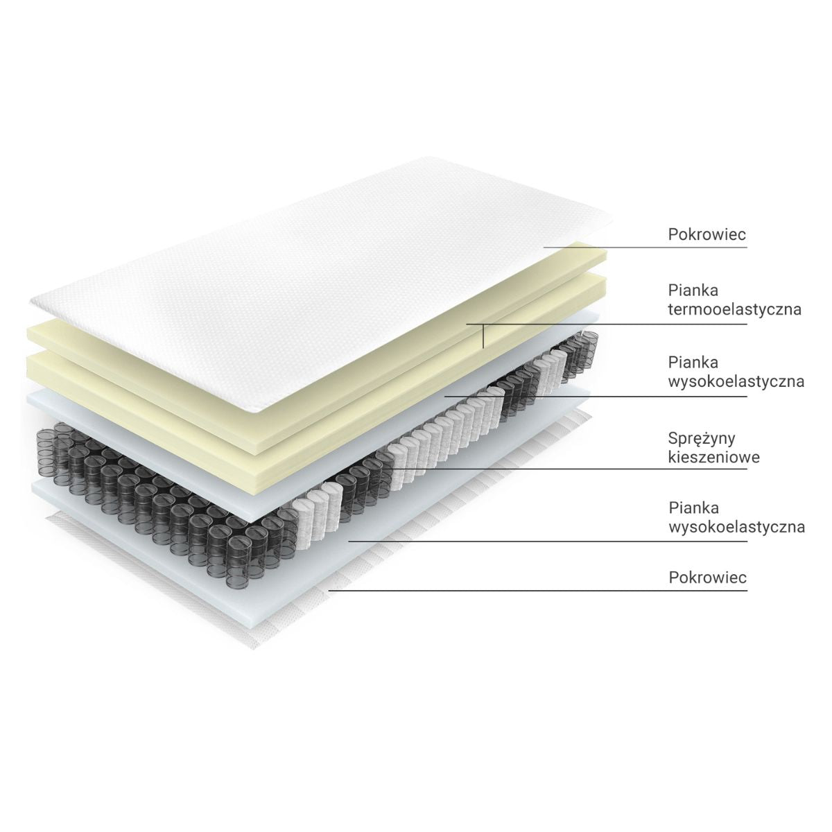Sprężyny kieszeniowe HR (zwiększona średnica grubości drutu w porównaniu ze standardowymi sprężynami) - 7 stref pracuje z osobna nad prawidłowym ułożeniem względem ciała oraz dają elastyczne podparcie górnej części materaca (12 cm)