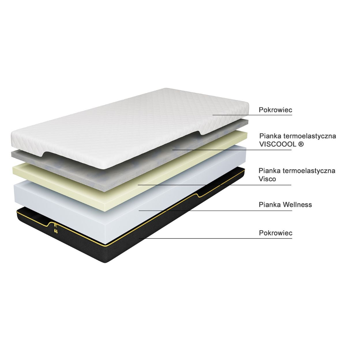 - Wysoki komfort oraz przyjemną lekkość zawdzięczamy warstwie pianki termoelastycznej Visco(4 cm, 55kg/m3), która dostosowuje się do kształtu ciała pod wpływem temperatury oraz reguluje temperaturę snu.