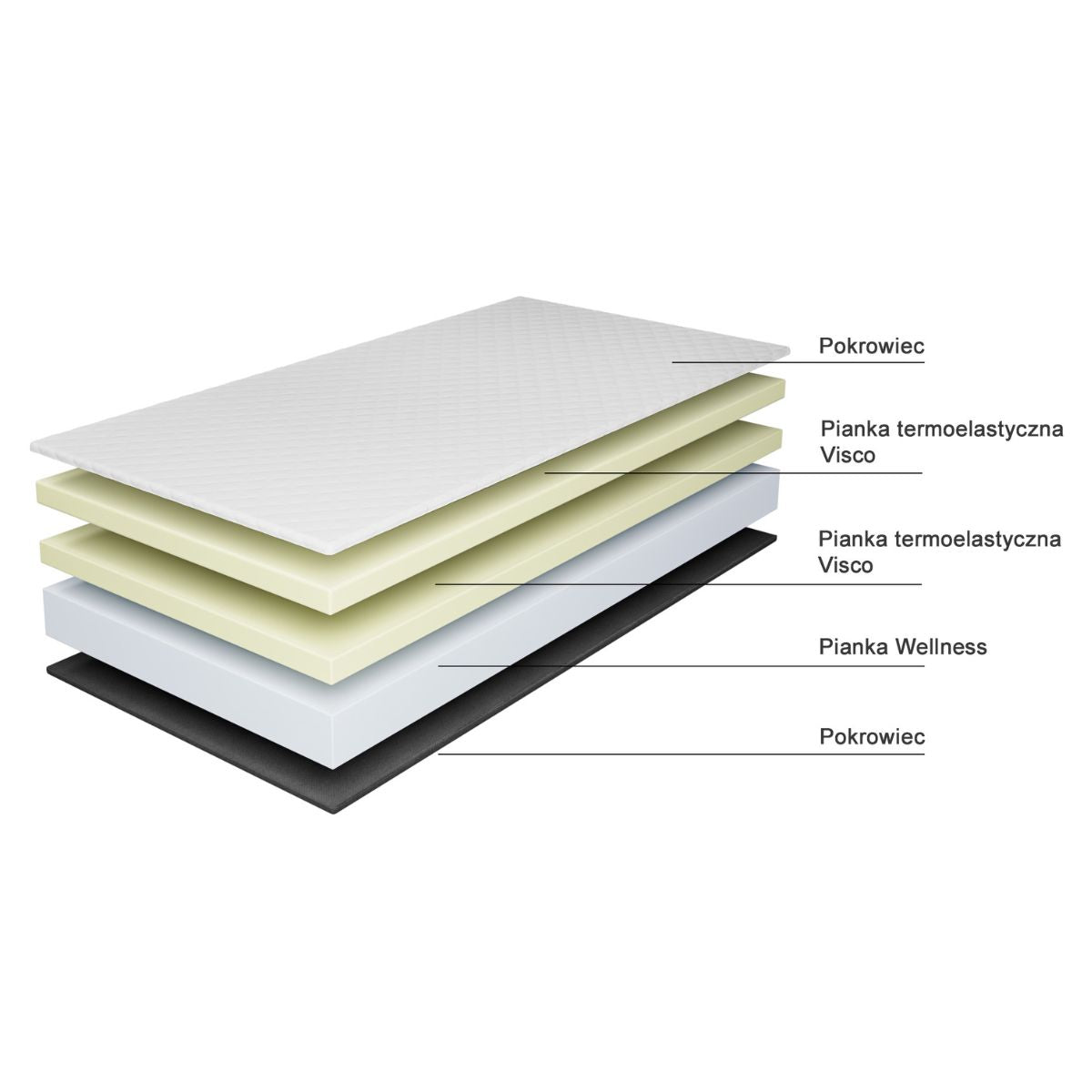 - Wysoki komfort oraz przyjemną lekkość zawdzięczamy warstwie pianki termoelastycznej Visco (6 cm, 50 kg/m3), która dostosowuje się do kształtu ciała pod wpływem temperatury.
