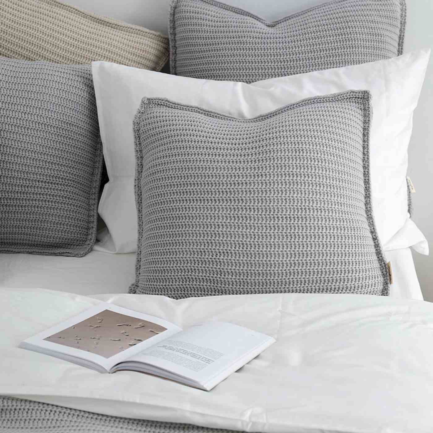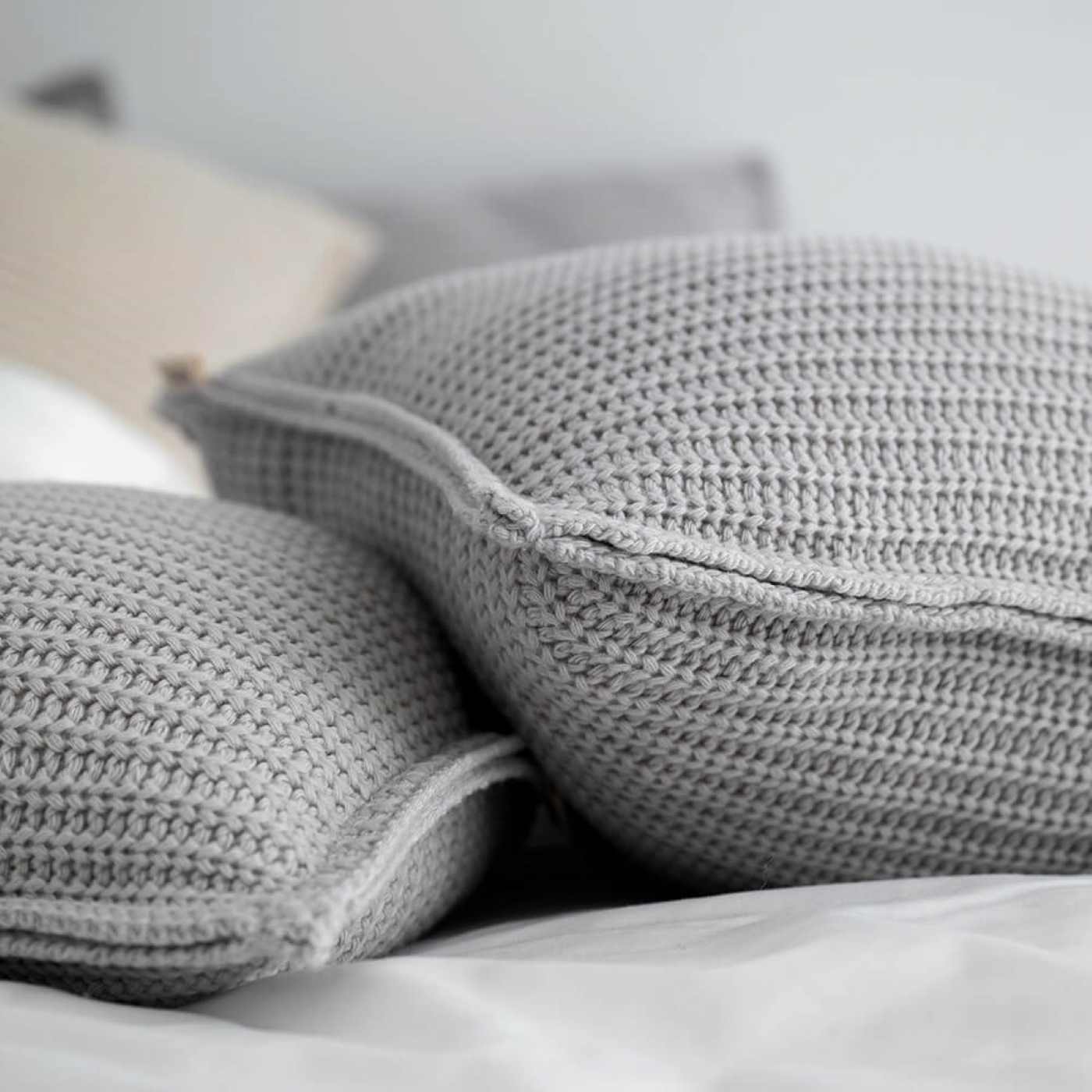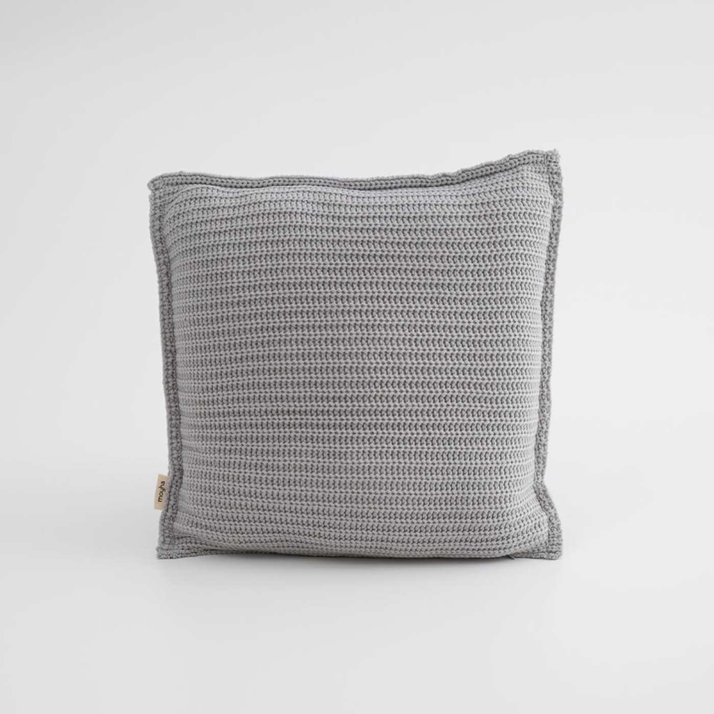 Poszewka w jasno szarym kolorze uszyta jest z miękkiej i niegryzącej przędzy z dodatkiem wełny (aż 50%). Ozdobny, przestrzenny splot podkreślony jest grubą, wełnianą przędzą.